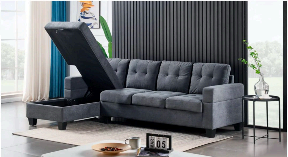 This stylish 4-seater L-shaped sofa is upholstered in soft grey fabric with black legs, offering a modern and functional design. It features tufted cushions for added comfort and includes built-in storage, making it a practical and elegant addition to any living space.